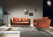Nowoczesna z odrobiną klasyki, lekka sofa, na pięknych metalowych nogach w kolorze miedzi. Farina jest starannie wykończona, dlatego może stać na środku pomieszczenia. Poduchy oparcia mają dekoracyjne przeszycie, które nadaje sofie elegancji.