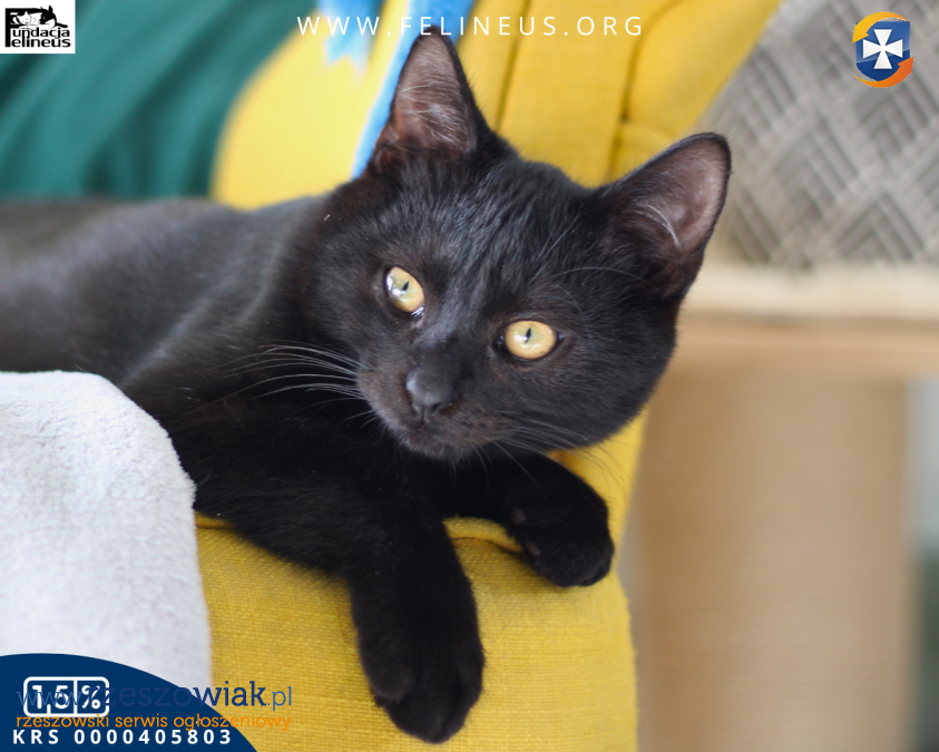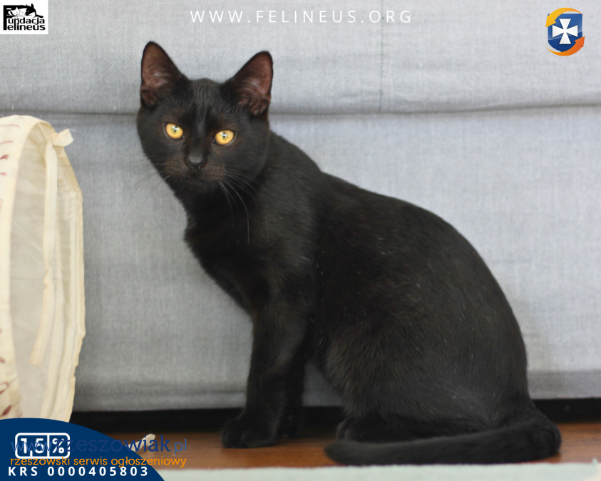 Febo, czarny kocurek urodzony w lipcu 2025r. Bardzo łagodny, bardzo spokojny, wręcz leniwy. Przyjaźnie nastawiony do wszystkich ludzi, zna towarzystwo dzieci. Śmiało można go wziąć na ręce Nie domaga się głaskania, ale chętnie przyjmie każdą dawkę pieszczot. Nie przeszkadzają mu hałasy w domu, nie boi się odkurzacza. Poranki lubi rozpoczynać od wietrzenia futerka na osiatkowanym balkonie, wieczorem zaś chętnie zaśnie przy boku człowieka. Szuka domu, w którym będzie miał towarzystwo kocie lub ludzkie, ponieważ nie lubi być sam. Pięknie korzysta z kuwety, wie co to drapak, nie grymasi przy jedzeniu. Słowem Febo to kot idealny