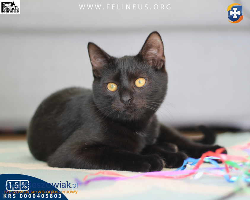 Febo, czarny kocurek urodzony w lipcu 2025r. Bardzo łagodny, bardzo spokojny, wręcz leniwy. Przyjaźnie nastawiony do wszystkich ludzi, zna towarzystwo dzieci. Śmiało można go wziąć na ręce Nie domaga się głaskania, ale chętnie przyjmie każdą dawkę pieszczot. Nie przeszkadzają mu hałasy w domu, nie boi się odkurzacza. Poranki lubi rozpoczynać od wietrzenia futerka na osiatkowanym balkonie, wieczorem zaś chętnie zaśnie przy boku człowieka. Szuka domu, w którym będzie miał towarzystwo kocie lub ludzkie, ponieważ nie lubi być sam. Pięknie korzysta z kuwety, wie co to drapak, nie grymasi przy jedzeniu. Słowem Febo to kot idealny