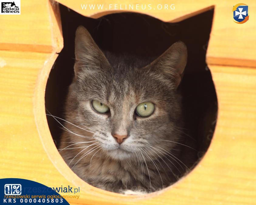 Fiona kotka urodzona w 2018 r. Jest kotem ostrożnym, nieufnym w stosunku do człowieka. Swoim bystrym spojrzeniem lubi obserwować życie innych domowników, jednak sama woli trzymać się na uboczu. Bardzo dobrze dogaduje się z innymi kotami oraz psem. Lubi wygrzewać swoje futerko na słonku i spać na drapaku.