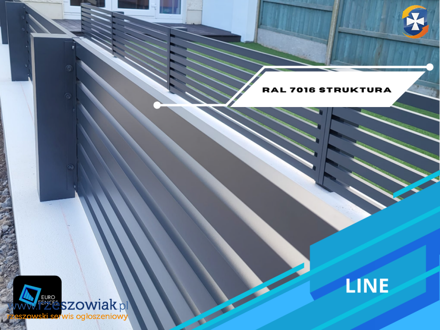 Profile aluminiowe malowane są proszkowo na dowolny kolor wybrany z palety RAL (3 faktury lakieru). Możliwe jest również zastosowanie okleiny drewnopodobnej (TERMODRUK) jako doskonałej alternatywy dla ogrodzeń drewnianych.