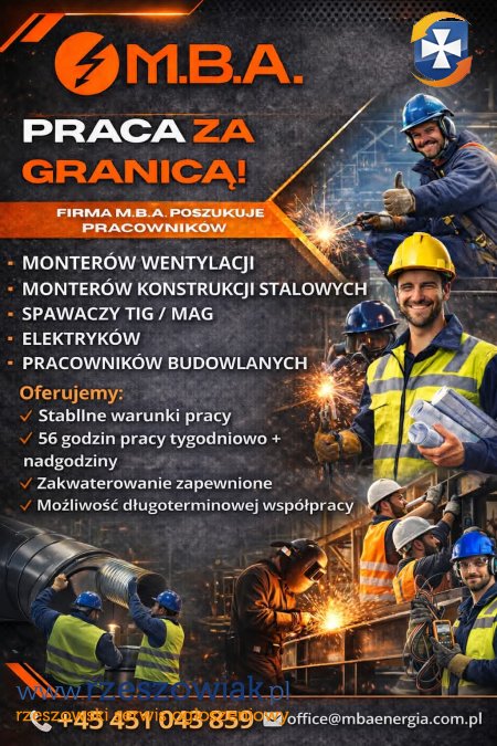 Firma M.B.A. Energia zatrudni pracowników do realizacji projektów w Europie Zachodniej na stanowiska: