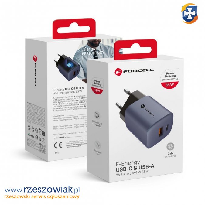 Ładowarka sieciowa Forcell wykonana w technologii GAN, o łącznej mocy 33 W. Obsługuje standardy ładowania Quick Charge 4.0 i Power Delivery, co pozwala na błyskawiczne ładowanie telefonów i tabletów wspierających szybkie ładowanie. Dwa porty â USB-A i USB-C â umożliwiają ładowanie dwóch urządzeń jednocześnie.