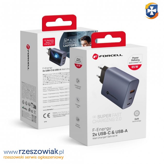 Ładowarka sieciowa Forcell wykonana w technologii GAN, o łącznej mocy 65 W. Obsługuje standardy ładowania Quick Charge 4.0, Power Delivery oraz Super Fast Charging 2.0 i pozwala na ładowanie zarówno telefonów i tabletów, jak i laptopów. Posiada trzy porty â dwa USB-C i jeden USB-A â i umożliwia zasilanie trzech urządzeń jednocześnie.