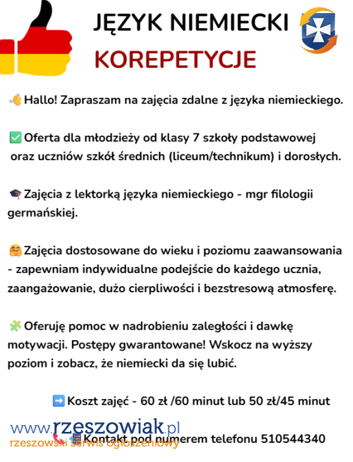 Niemiecki i dzielenie się wiedzą to moje hobby. Mam siedmioletnie doświadczenie w udzielaniu korepetycji młodzieży, a od niedawna również dorosłym. Nauczanie daje mi dużo satysfakcji. Zajęcia dostosowuję do wieku i poziomu zaawansowania - zapewniam indywidualne podejście do każdego ucznia, zaangażowanie, dużo cierpliwości i bezstresową atmosferę. Pomogę w nadrobieniu zaległości, zmotywuję i postaram się pokazać, że niemiecki da się lubić. Zainteresowane osoby zapraszam do kontaktu na podany nr telefonu :)