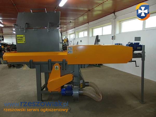 W zestawie do maszyny znajduje się również osłona, która umożliwia zastosowanie produkowanego przez nas przenośnika taśmowego odbierającego otrzymane wióry ( używana jest gdy maszyna służy do rozdrabniania większych kawałków drewna, odpadów płyty wiórowej itp) .