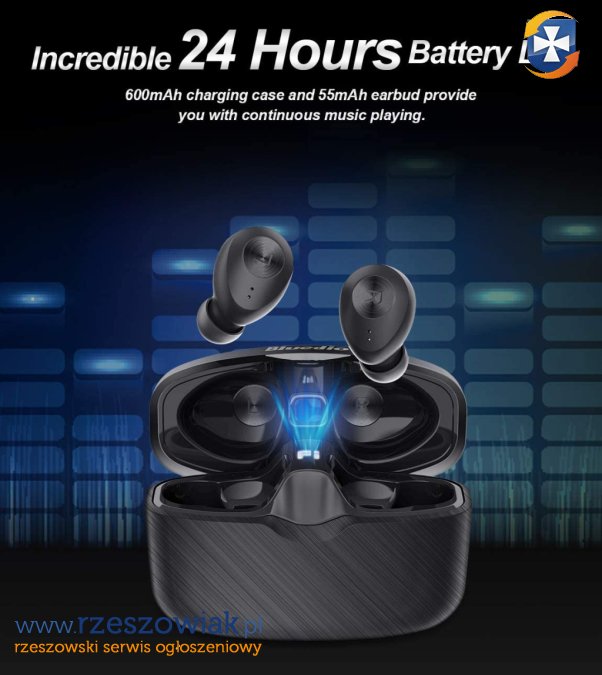 * 24 godziny działania słuchawek z etui a czas czuwania to około 1000 godzin (wbudowany akumulator 600 mAh);
