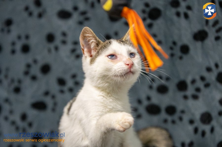 Życie go nie oszczędziło⌠Koci katar zebrał żniwo w postaci uszkodzenia oczu. Lewe oko: niestety nie widzi. Prawe oko: widzi, i jest szansa na zachowanie normalnego widzenia, o ile choroba wirusowa nie uszkodzi rogówki w przyszłości. Aktualnie brak zmian w rogówce. Trzeba uważnie leczyć i kontrolować, żeby choroba nie postąpiła. Widzenie obuoczne (normalne jak u zdrowego kota) â niestety mało prawdopodobne.