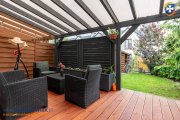 Zadaszony, przestronny taras w ogrodzie, wykonany z drewnianej deski tarasowej (miłorząb)
