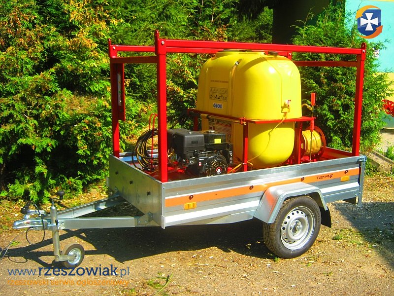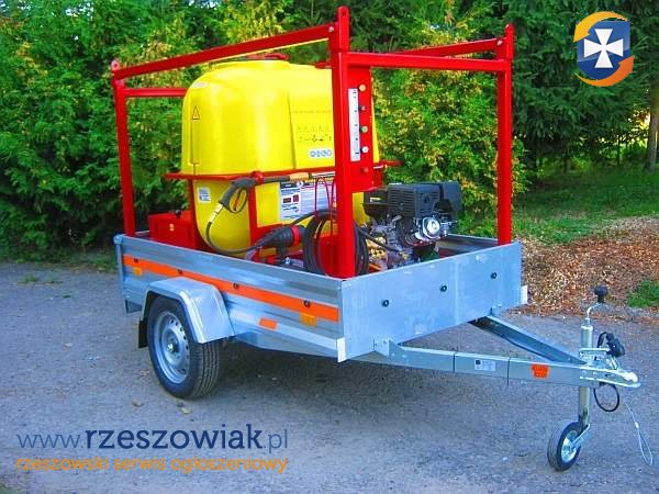 Jesteśmy producentem myjek wysokociśnieniowych montowanych na podwoziu jezdnym z homologacją. Urządzenie posiada własny zbiornik na wodę oraz wbudowany oddzielny zbiornik na środek myjący o pojemności 10l.