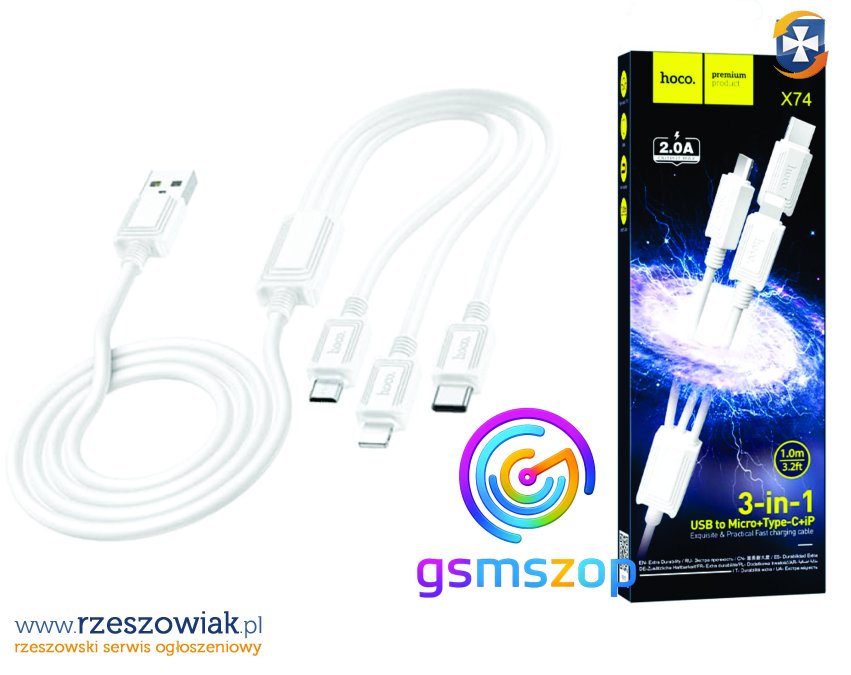 Kabel ładujący 3w1 X74 ze złączami USB-A â Lightning /Micro USB / USB-C.