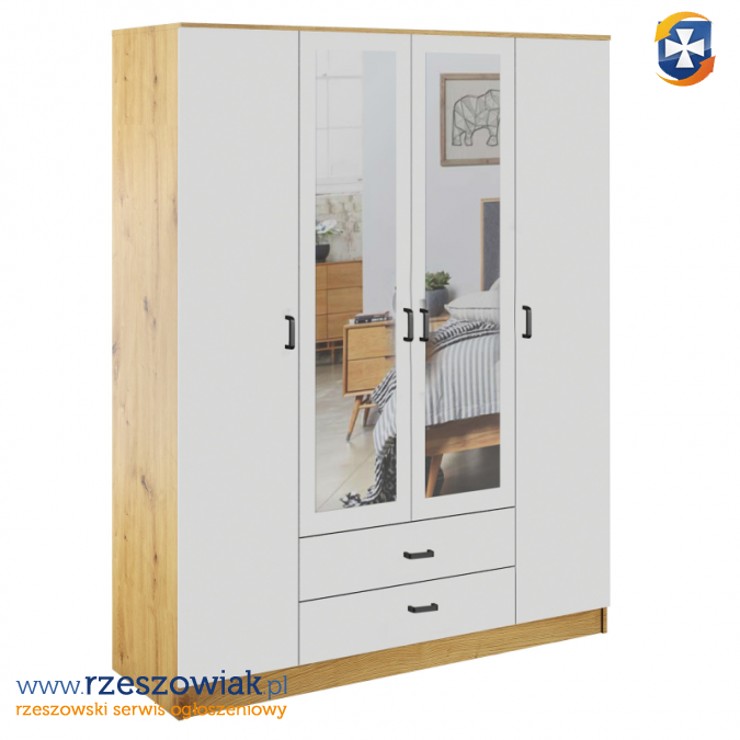 Praktyczna i elegancka szafa o wymiarach: szerokość 160 cm, wysokość 205,6 cm, głębokość 53,8 cm. Model wyposażony jest w cztery drzwi, z czego środkowe posiadają lustro, które nie tylko optycznie powiększa przestrzeń, ale też jest bardzo funkcjonalne na co dzień.