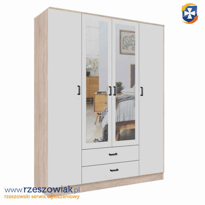 Praktyczna i elegancka szafa o wymiarach: szerokość 160 cm, wysokość 205,6 cm, głębokość 53,8 cm. Model wyposażony jest w cztery drzwi, z czego środkowe posiadają lustro, które nie tylko optycznie powiększa przestrzeń, ale też jest bardzo funkcjonalne na co dzień.