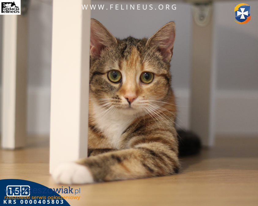 Karmelka to trzykolorowa kotka urodzona w marcu 2025 roku. Bardzo ciekawska i niezależna. Lubi towarzystwo człowieka, zabawy szczególnie wędka i piłeczkami oraz wspólne spędzanie czasu.