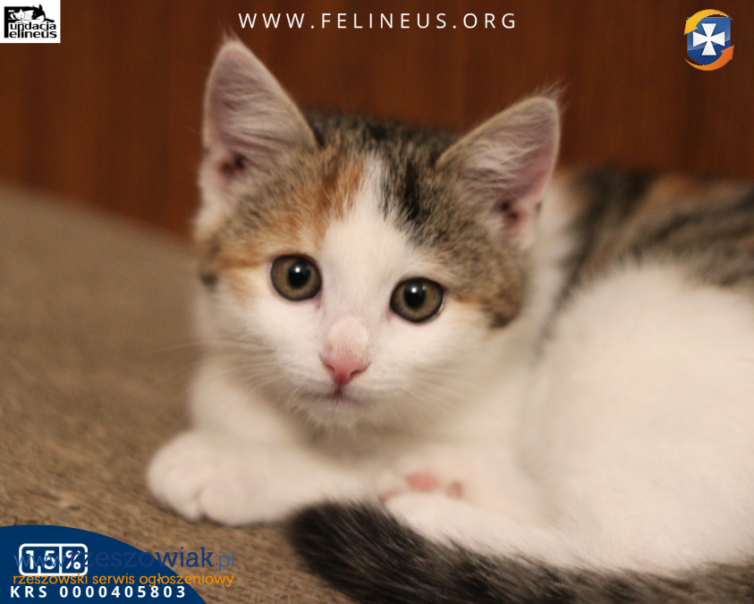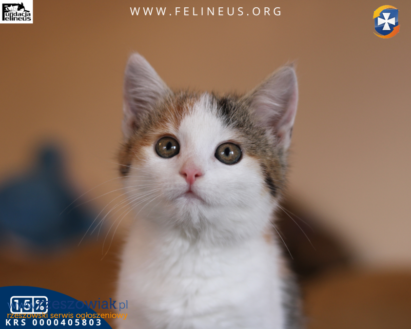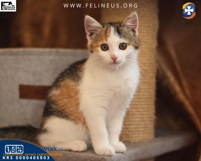 Kleksia to ślicznie ubarwiona koteczka. Jej kolorowe futerko jest bardzo puszyste i mięciutkie. Kotka urodziła się prawdopodobnie w sierpniu 2025r. Pod opieką Fundacji trafiła w wieku około 6 tygodni. Bardzo szybko zaprzyjaźniła się z opiekunami i kotkami mieszkającymi w domu tymczasowym. Jest bardzo odważna. Obserwując inne kotki szybko nauczyła się co to kuweta. Kleksia super sobie radzi, ale nie lubi być sama. Najlepiej się czuje gdy opiekun jest obok. Lub inny koci towarzysz pozwoli się wtulić w swoje futerko. Szukamy dla Niej domu gdzie spełnione będą wymogi bezpieczeństwa. Kot będzie niewychodzacy, a okna i balkony osiatkowane. Kleksia bardzo chętnie zamieszka w domu gdzie jest już inny kotek. Może zabrać też towarzysza z domu tymczasowego. Na tym etapie życia nie nadaje się do domu w którym po kilka godzin była by sama w mieszkaniu.