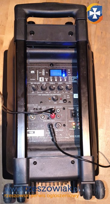 Kolumna świetnie i głośno gra Działa tylko na zasilaczu(12V brak w zestawie) bateria słaba Używany tylko na płączeniu kablowym jak na zdjęciu (cinch) Sprzedaję sam głośnik mobilny