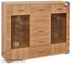 Komoda GRESS 2w3s1b to idealny mebel do salonu, pokoju dziennego lub jadalni. Tym co ją wyróżnia jest barek. Oprócz niego jak przystało na każdą komodę jej wnętrze wypełniają szuflady i półki. Przeszklone fronty pozwolą wyeksponować dodatki lub dekoracje. Dzięki temu uzyskano mebel funkcjonalny, a jednocześnie oryginalny i dobrze się prezentujący. Jak wszystkie meble z kolekcji GRESS również tą komodę zdobią ryflowane listwy nadające specyficzny i niepowtarzalny charakter. Mebel dostępny jest w kolorystyce dąb sonoma.