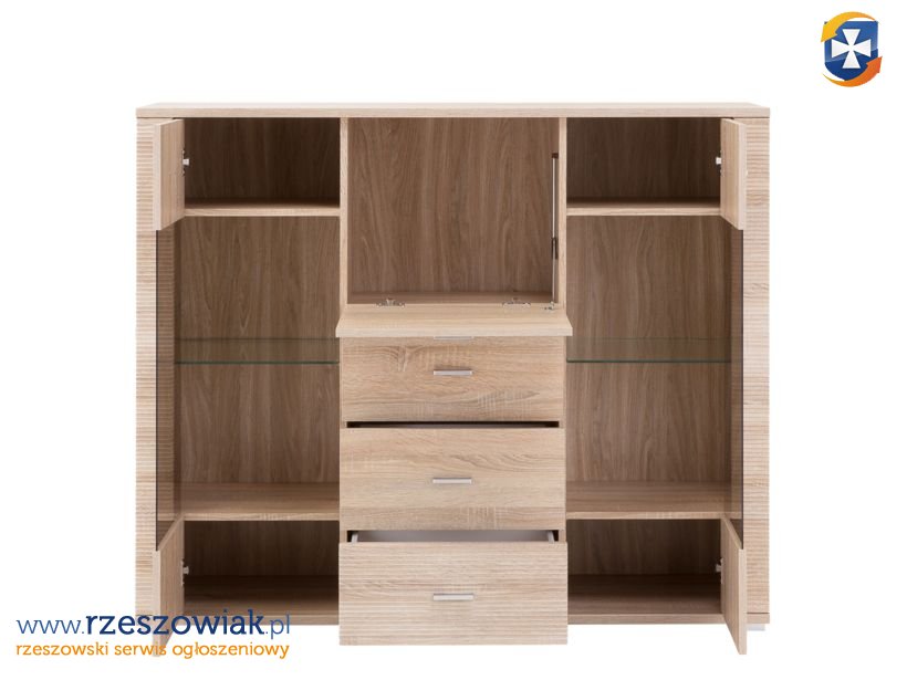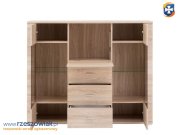 Komoda GRESS 2w3s1b to idealny mebel do salonu, pokoju dziennego lub jadalni. Tym co ją wyróżnia jest barek. Oprócz niego jak przystało na każdą komodę jej wnętrze wypełniają szuflady i półki. Przeszklone fronty pozwolą wyeksponować dodatki lub dekoracje. Dzięki temu uzyskano mebel funkcjonalny, a jednocześnie oryginalny i dobrze się prezentujący. Jak wszystkie meble z kolekcji GRESS również tą komodę zdobią ryflowane listwy nadające specyficzny i niepowtarzalny charakter. Mebel dostępny jest w kolorystyce dąb sonoma.