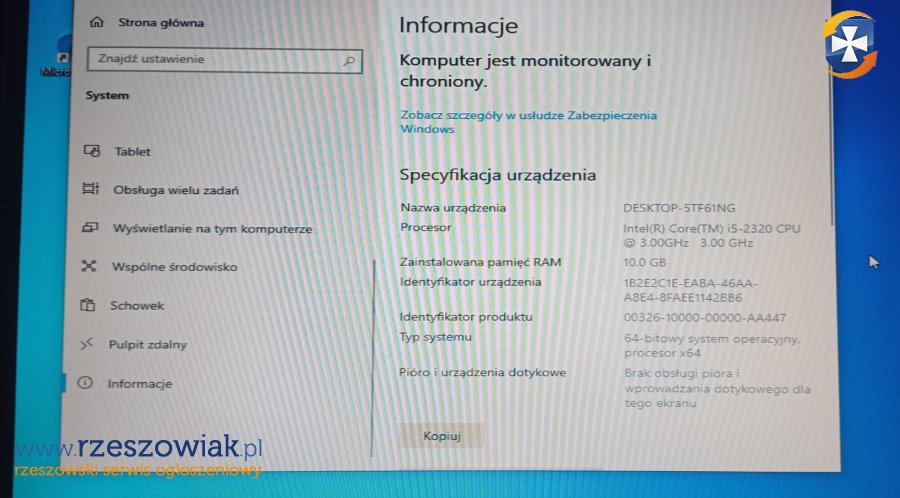 Komputer używany testowo zainstalowany Win 10 Procesor i5 2320 3GHz Ram 10 GB Dysk 500 GB Grafika Geforce 9600 GT 512MB Nagrywarka DVD