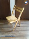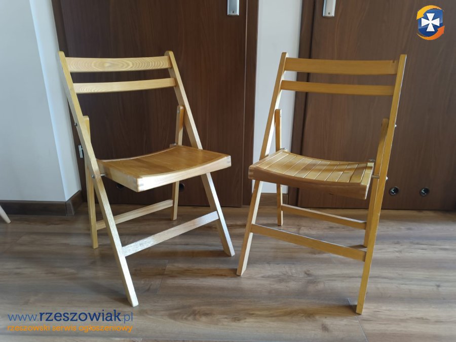 Krzesła drewniane składane w dobrym stanie. Normalne ślady użytkowania. 2 krzesła są takie same trzecie różni się minimalnie.