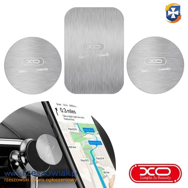 XO Y2 to zestaw jednej prostokątnej i 2 okrągłych metalowych płytek, które po przyklejeniu na obudowę lub etui telefonu, umożliwiają korzystanie z magnetycznych uchwytów samochodowych.