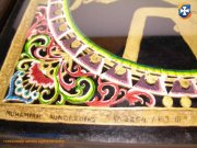 Ładny unikatowy obraz w solidnej drewnianej ramie w kolorze czarnym - oryginalny obraz wykonany techniką wycinanek we wzory marokańskie, malowany ręcznie złotą i kolorowymi emaliami. Z tyłu obrazu opis i pieczątka oryginalności Akademii Sztuk Pięknych. Obrazek za szkłem.