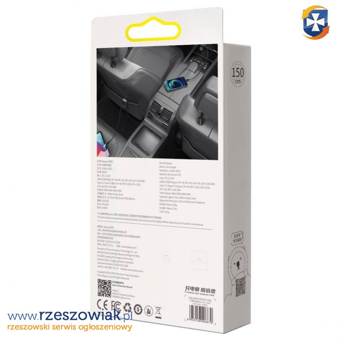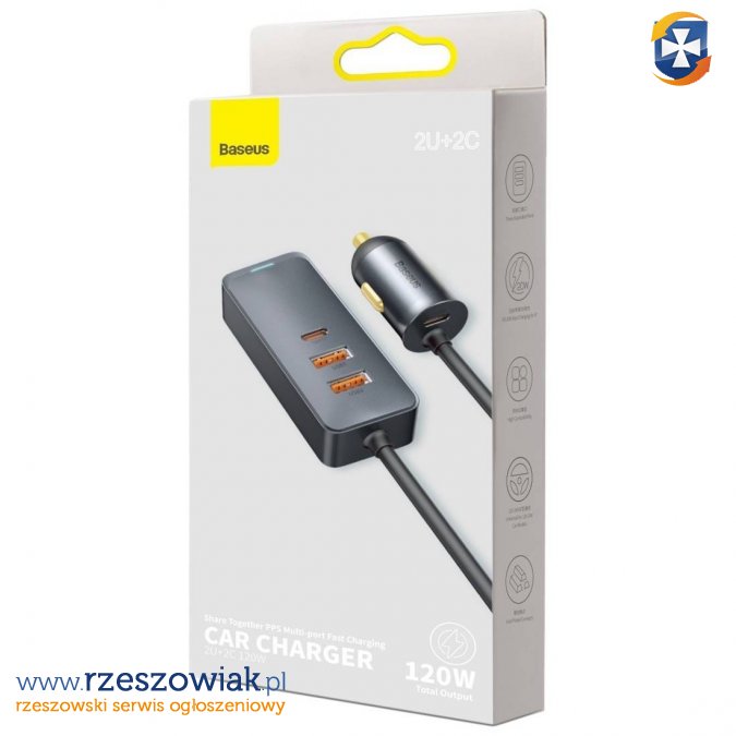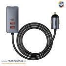 Ładowarka samochodowa Baseus Share Together z przedłużaczem, 2x USB, 2x USB-C, 120W (szara)