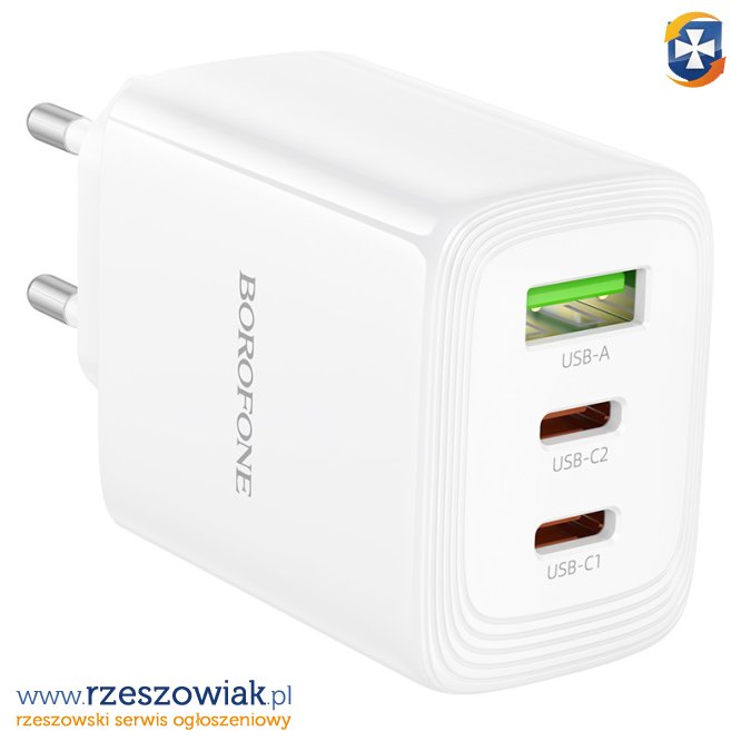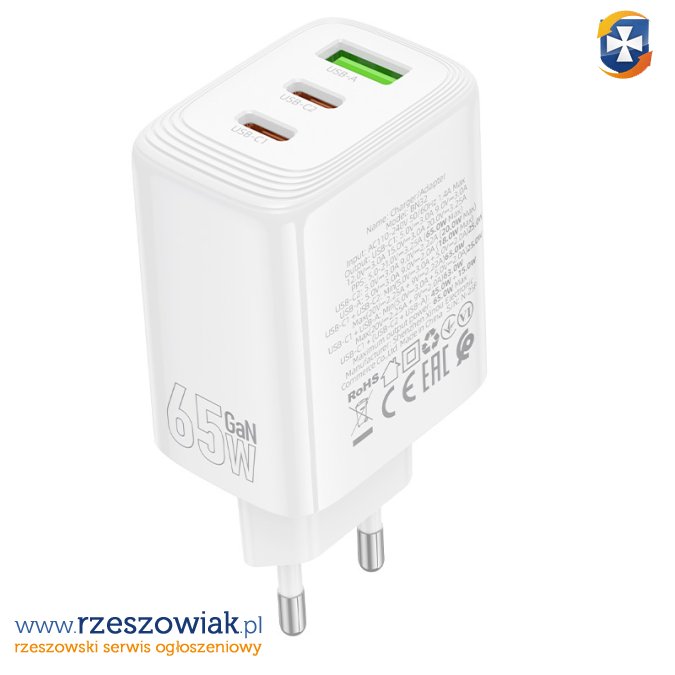 Dzięki trzem portom (USB-C1, USB-C2 oraz USB-A) oferuje łączną moc do 65W i obsługuje standardy szybkiego ładowania PD, QC, FCP oraz AFC. Wykonana z ognioodpornego tworzywa PC, gwarantuje bezpieczeństwo i niezawodność podczas codziennego użytkowania