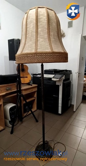 Lampa stojąca, mosiężna z oryginalnym lnianym abażurem. Lampa na dwie żarówki, na okrągłej podstawie, sprawna. Wysokość z abażurem mniej więcej 180 cm. Średnica abażuru dół 60cm, góra 30 cm. Lampa do obejrzenia i kupna w Rzeszowie. Zapraszam do kontaktu: tel 608 366 444