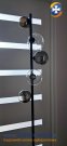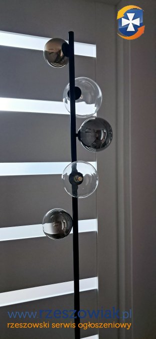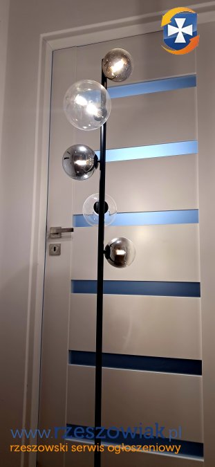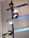 Lampa stojąca podłogowa z czarną, aluminiową konstrukcją i szklanymi kloszami. Posiada 5 kloszy, w tym 2 duże przezroczyste, 2 mniejsze w kolorze grafitowym i 1 najmniejszy miedziany. Włącznik nożny, długość kabla ok 2m. Wysokość lampy:173cm. Lampka użytkowana max. 2 razy.