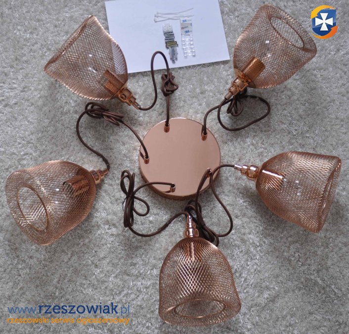 Lampa sufitowa pięciopunktowa, metalowa, oprawy z gwintem E27 â standardowa żarówka LED, halogen lub zwykła żarnikowa.
