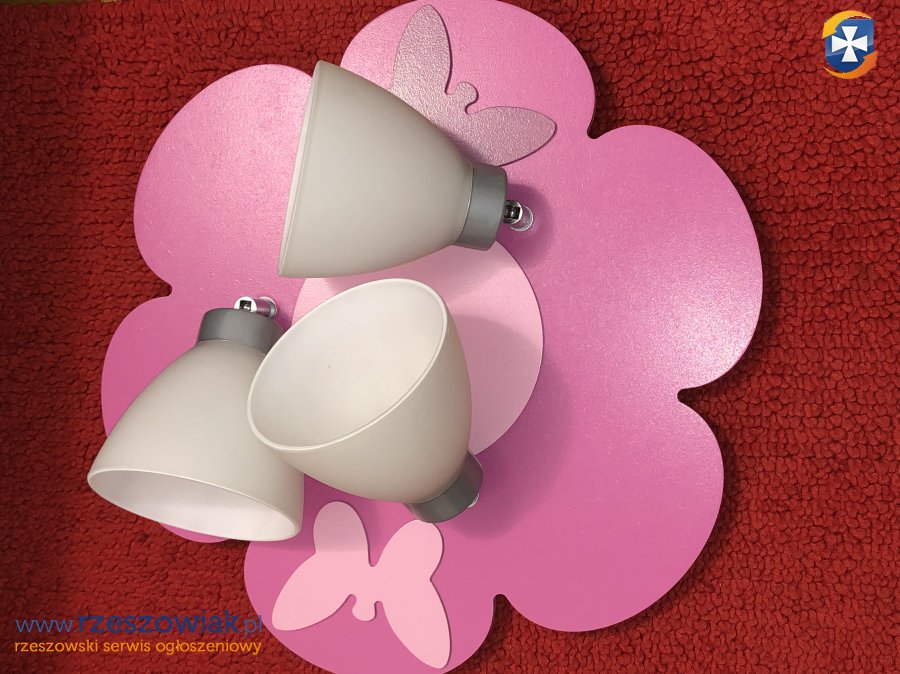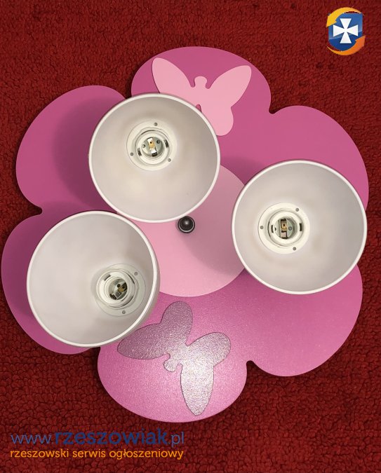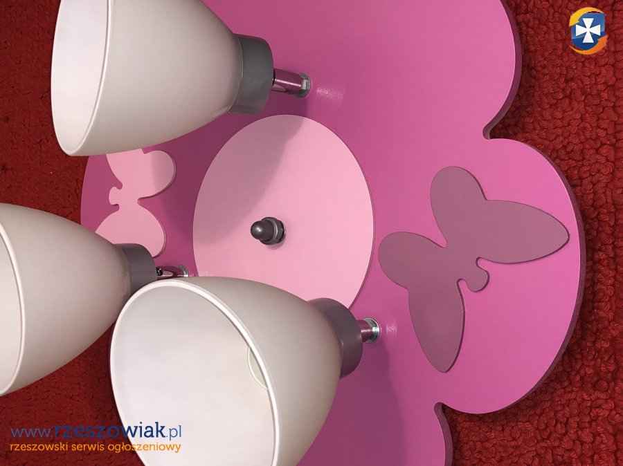 Lampa sufitowa kwiat z motylkami. Trzy obrotowe klosze z możliwością regulacji ustawienia kierunku oświetlenia. Stan idealny. Średnica 47,5 cm. Odbiór w Rzeszowie.