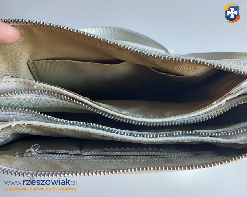 Listonoszka Toscanio w kolorze śmietankowym, zasuwana na zamek, w środku trzy komory, pasek długi, regulowany. Torebka w stanie bardzo dobrym, zamek jest brudny od używania, do wyczyszczenia