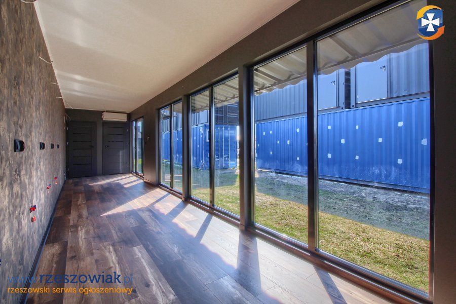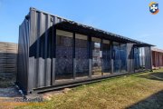 Od frontu znajdują się liczne przeszklenia. Został wykonany przez firmę, która specjalizującą się w przerabianiu kontenerów morskich, udzielana jest gwarancja.