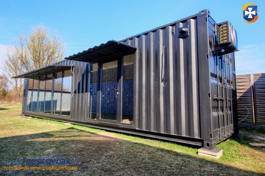 Od frontu znajdują się liczne przeszklenia. Został wykonany przez firmę, która specjalizującą się w przerabianiu kontenerów morskich, udzielana jest gwarancja.