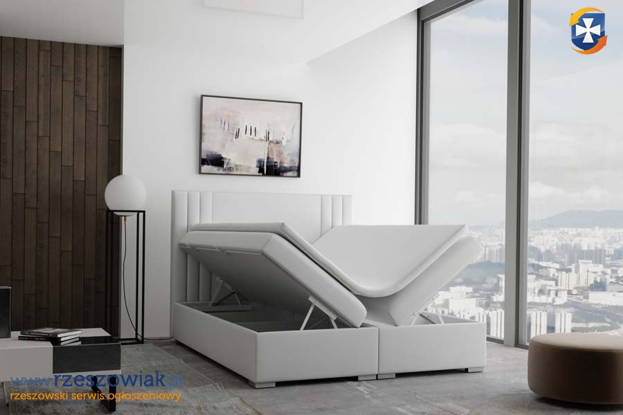 W standardzie - Dolna skrzynia łóżka pełni rolę pojemnika na pościel, do którego dostęp uzyskujemy unosząc materace do góry. Standardowy materac bazowy jest wykonywany ze sprężyn bonelowych oraz pianki tapicerskiej typu T-25. Na materacu bazowym umieszczono materac nawierzchniowy (Topper 5cm) wykonany z pianki tapicerskiej typu T-25.