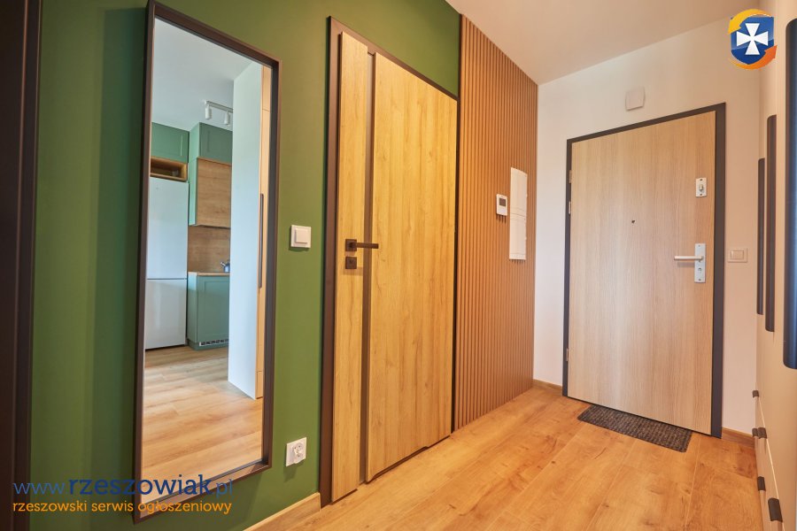 Pełne umeblowanie każdego pomieszczenia. W sypialni stylowa tapeta na ścianie. W sypialni wygodne łóżko, szafa. W przedpokoju szafa w zabudowie.