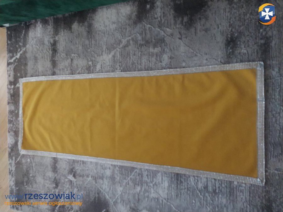 Mam do sprzedania 3 bieżniki w kolorze żółtym z ozdobnym obszyciem o wymiarach 140 cm x 50 cm.