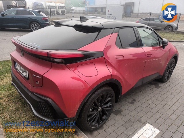 Mam do sprzedania praktycznie nowe auto Toyota C-HR w wersji GR Sport 2.0 223 KM Hybryda Plug-in w kolorze czerwonym z czarnym dachem, rocznik 2024, ale pierwsza rejestracja wrzesień 2025.