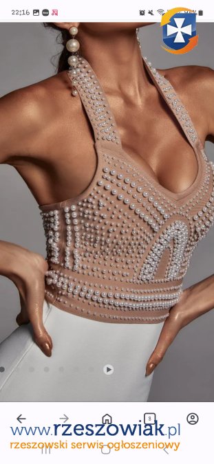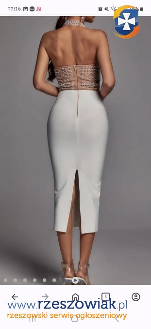 Sukienka zapinana z tyłu na kryty zamek i haftkę na górze; posiada wieszaczki do zawieszenia sukienki. Sukienka jest w bardzo dobrym stanie, nie zniszczona i nie poplamiona, perełki nie spłowiały i nie łuszczą się; noszona przeze mnie 2 razy.