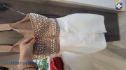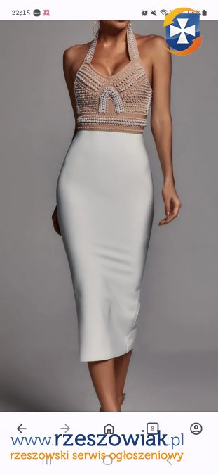 Sukienka zapinana z tyłu na kryty zamek i haftkę na górze; posiada wieszaczki do zawieszenia sukienki. Sukienka jest w bardzo dobrym stanie, nie zniszczona i nie poplamiona, perełki nie spłowiały i nie łuszczą się; noszona przeze mnie 2 razy.