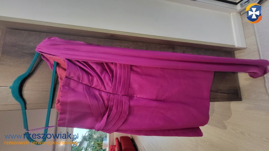 Mam do sprzedania używaną sukienkę wieczorową/weselną w kolorze różowym - fuksja. Sukienka ma rozmiar ok 40, szyta była pod zamówienie dla konkretnej osoby w salonie sukien ślubnych i wieczorowych. Jej wymiary to : długość 90 cm, szerokość pod pachami 42 cm, szerokość w tali 40 cm, długość szarfy 127 cm. Sukienka zapinana na kryty zamek z tyłu, posiada sztywne stalki i wyprofilowane szycie w biuście. Materiał to satyna atłasowa, pięknie się mieni. Do sukienki nie są dołączone 2 ozdoby z cyrkonii. Możliwy jest odbiór osobisty lub wysyłka TYLKO pocztexem, po zaksięgowaniu pieniędzy na moim koncie - koszt wysyłki to 20 zł.