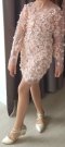 Mam do sprzedania wyjątkową, jedyną w swoim rodzaju mini sukienkę dla dziewczynki wieczorowo-imprezową, szytą na miarę od projektantki Aleksandry Wiśniewskiej. Sukienka użyta przez córkę 2 razy, w stanie idealnym. Sukienka wykonana jest cała z delikatnego tiulu i ozdobiona kwiatami i cyrkoniami, w pasie ozdobny cyrkoniowy pasek, z tyłu zapinana na zamek. Z racji tiulowego materiału sukienka w ogóle nie jest naciągliwa, wiec podam dokładne wymiary na jakie została uszyta: