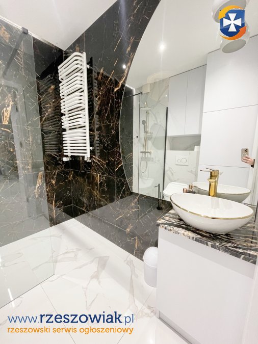 - w łazience: umywalka z szafką, lustro, szafka wisząca, kabina prysznicowa, kompakt wc.