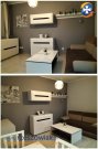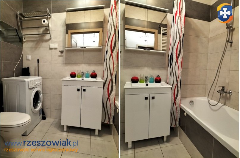 - Łazienka: wanna, pralką, miska WC, szafka z umywalką, szafka wisząca, wieszak na ręczniki