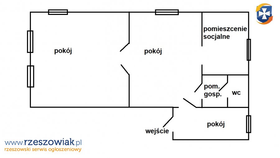 - pokój biurowy z przejściem do pomieszczenia socjalnego, wc i drugiego pokoju