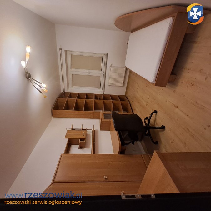 - w pokoju: szafa, biurko, fotel, regał, szafka,