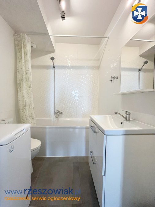 - w łazience: wanna, lustro, umywalka z szafką, pralka, kompakt wc.
