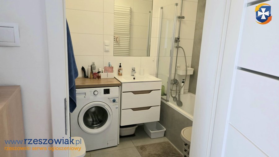 W mieszkaniu jest pralka, TV i duży balkon