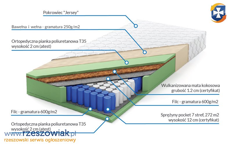 Mamy do zaoferowania materace najwyższej jakości w bardzo rozsądnej cenie, 7 strefowy, lato /zima, materac wykonany z sprężyn o grubości drutu 1,8 mm, z pianką T35 i pikowaną matą kokosową o grubości 1,2 mm. Na cały materac udzielamy 5 lat gwarancji i wszystkie komponenty użyte do wyprodukowania materaca posiadają certyfikaty: